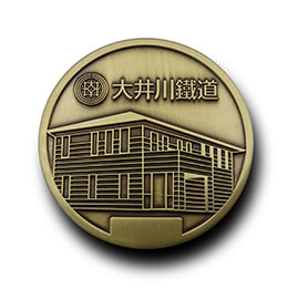 直径45mmという大きな丸い仕様の両面をいっぱいに使い、繊細な図案があしらわれたのは「100周年記念メダル」。表側には鉄道会社である同社の創業年を表す「1925」の数字と、その部分だけ黒で着色された蒸気機関車「C121」の雄姿が入り、裏側には「大井川鐵道」の社名と新金谷の駅舎が描かれています。因みにこのデザインは当社が新たに起こしたものですが、モチーフは同社からご提供いただいたデータでした。