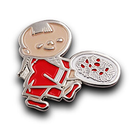 キャラクターをモチーフにしたピンバッジは、当社もこれまでに数多く手掛けてきましたが、その中でも今回の作品に取り上げられたのは、三つ編みと前髪がチャームポイントでおなじみのかわいい男の子です。ご依頼主は兵庫県神戸市中央区のケンミン食品株式会社様。今回の前にも大阪・関西万博用のピンバッジを製作させていただいており、「仕上げなどに満足していた」という理由から再度ご用命をいただきました。オリジナルのコミュニケーションツールとして当社に託されたのは「ケンミンぼうやピンバッジ」です。
