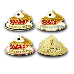 なにやら美味しそうなスイーツにオシャレな赤いラインストーンをあしらった可愛らしいピンバッジ。製作された小林様は、ピンバッジとお笑いが大好きな千葉県在住の主婦の方。小学生の頃に訪れた万博のパビリオンでもらったバッジをきっかけに、ピンバッジ・ファンになられたそうです。それ以来、コレクションがどんどん増えていったとか。そんな小林様が、今、注目しているのが人気上昇中の女性お笑いコンビ「チェリー☆パイ」。グラビア・アイドルのようにキュートな水着姿でショートコントを披露しているコンビです。オリジナル・デザインの「チェリーパイピンバッジ」は、小林様がチェリー☆パイのお二人にプレゼントするために製作されました。