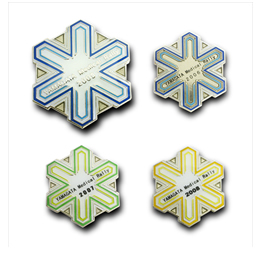 作品はメディカルラリーで配布する参加証として使用され、文字を金属の凹凸で表現した29mmサイズの第1弾が完成したのは2005年。以降は複数の装着を考慮して一回り小さくなり、文字をプリントで表現した今回の「メディカルラリー’09ピンズ」まで計5種類の仕様が誕生しました。雪の結晶をモチーフにした形と中央に黒で入った「YAMAGATA Medical Rally」の文字はそのままに、西暦を表す数字と結晶の色を年ごとに変えたオリジナルグッズは、「コレクションとして欲しがる方が多く、“継続的な参加意欲の向上” という目的を達成しています」とのこと。