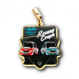 代表者の伊藤様は神奈川県にお住まいのカーフリーク。ストラップのモチーフにも取り上げられている「1970年式マツダファミリアロータリークーペ」は、クラシックカーラリーのビッグイベントとして知られるラリーニッポンに2011年から参戦している愛車です。デザインを手がけられたのはプロの方だそうで、その名も「くーぺ」というイラストレーターさん。今回のストラップはこれまでの丸いものと趣が少し違い、重ねた2つの図形で奥行きを感じさせる仕様となっています。この車種を選ばれたのは、応援してくれるギャラリーや仲間、ブログ読者に「ギブアウェイ」で渡したいとのお考えからでした。