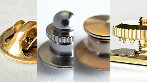ピンバッチにはさまざまな留め具(キャッチ)の種類があります。“つまみ” が蝶の羽のような形状をしたバタフライクラッチは、ピンバッジの代表的な留め具(キャッチ)と言って良いでしょう。その他にもバタフライクラッチよりフォーマルなシーンのピンズに使用されるタイタックや、ねじ式で定着力のあるスクリューナットなど、ピンバッチには様々な留め具(キャッチ)の種類があります。